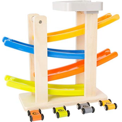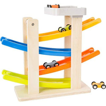 Rennbahn mit Parkdeck aus Holz – personalisierbar, inkl. 4 Autos | small foot 10602