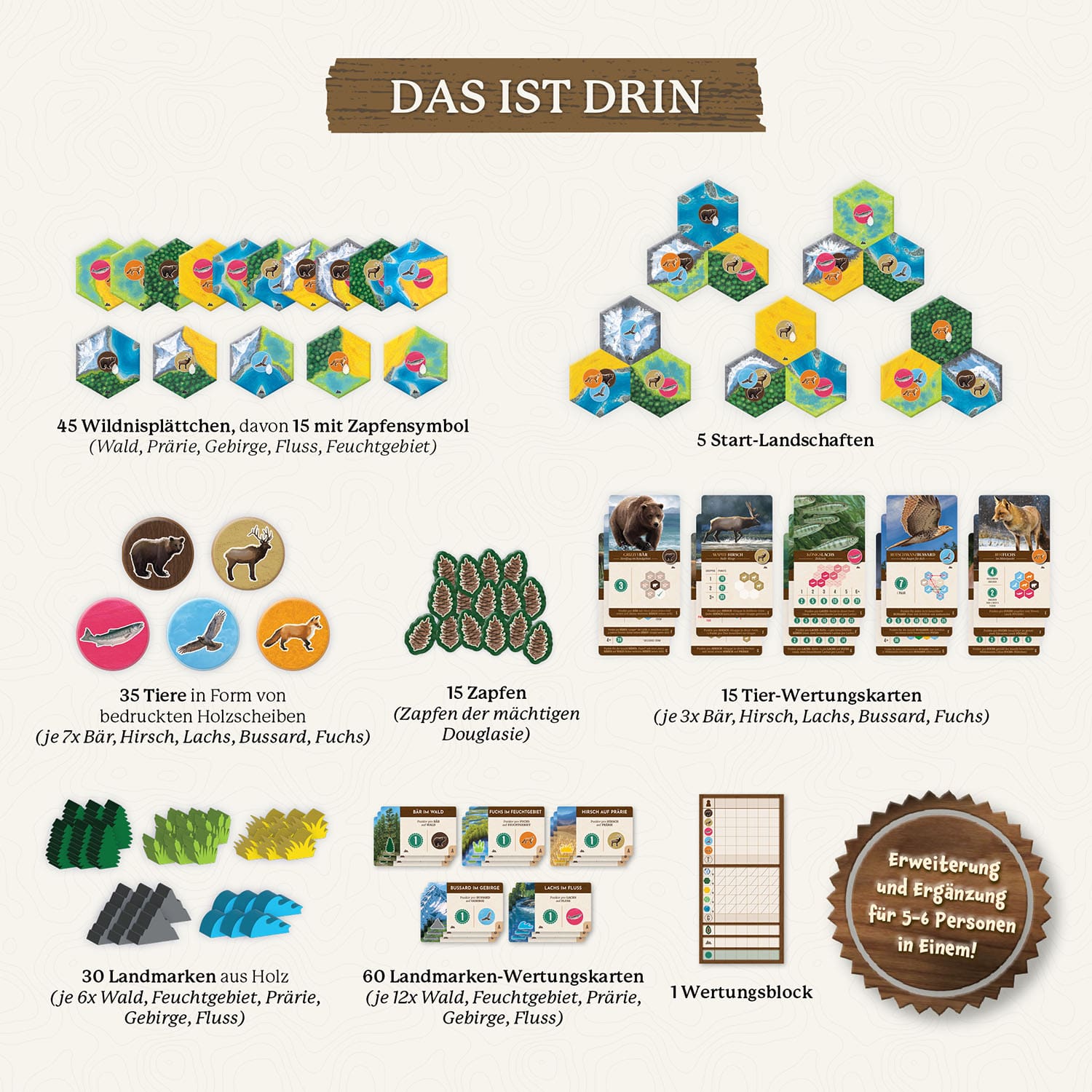 Cascadia wächst weiter! Endlich das „Spiel des Jahres 2022“ mit bis zu 6 Personen spielen und zusätzliche Spielelemente entdecken. Mit dieser Erweiterung weiterhin weitläufige Lebensräume erschaffen und neue schöne natürliche Wahrzeichen, die Landmarken, darin platzieren. Diese verleihen jeder Umgebung ihr eigenes Aussehen und ermöglichen wertvolle Punkte bei Spielende. Zusätzlich enthalten sind neue Wertungskarten für die Tiere. Die Erweiterung ist nur mit dem Grundspiel spielbar. Für Familien ab 10 Jahren.