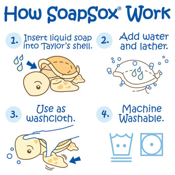 Der weiche SoapSox Badeschwamm in Schildkrötenform macht das Baden für Kinder zum echten Vergnügen! Mit seinem integrierten Seifenfach für feste oder flüssige Seife entsteht beim Waschen extra viel Schaum – für noch mehr Spaß im Wasser.Dank der Fingertaschen liegt der Schwamm besonders gut in der Hand – ideal für Eltern und Kinder. Die niedliche Schildkröte ist Teil einer fröhlichen Tierfamilie mit sieben unterschiedlichen Designs – sammeln macht Freude!