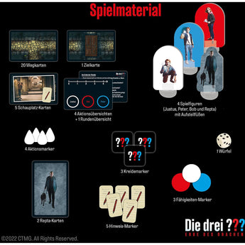 Der neue Kinofilm zum Spielen! Mysteriöse Vorfälle führen Justus, Bob und Peter in diesem Abenteuer nach Transsylvanien. Wer steckt hinter dem geheimnisvollen Drachenorden? Die drei ??? ermitteln im alten Schloss Piatra. Aber Achtung! Die Detektive werden verfolgt. Hausmeister Hector und sein Hund sind den Freunden dicht auf den Fersen. In diesem Mitbringspiel decken die Spielerinnen und Spieler Karte für Karte den Weg durch das Schloss auf, suchen nach Hinweisen und nutzen die besonderen Fähigkeiten der Detektive. Ein cooles Krimi-Spiel mit exklusivem Bildmaterial aus dem neuen Film.