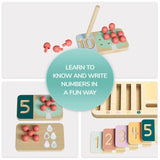 Wie viele Äpfel sind 5? Mit zehn Holztafeln für die Zahlen eins bis zehn und Früchten zum Stecken ermutigt der TOPBRIGHT Fruchtbaum-Zahlentrainer Kinder ab 36 Monaten, Mengen und Zahlen zu verstehen. Kinder platzieren die entsprechende Anzahl kleiner roter Äpfel auf dem Fruchtbaum jeder hölzernen Zahlenkarte. Mit dem beiliegenden Holzstift fahren sie die Vertiefungen der Zahlen auf den Holztafeln nach und lernen so, die Zahlen zu schreiben. Jüngere Kinder trainieren ihre Feinmotorik und erkennen verschiedene Farben auf den Holztafeln, während ältere Kinder Zahlen kennenlernen und mit dem Zahlen- und Schreibtrainer das Zählen üben. Auf der Rückseite jeder Zahlenkarte sind verschiedene Obstsorten abgebildet, sodass Kinder neue Früchte kennenlernen können.